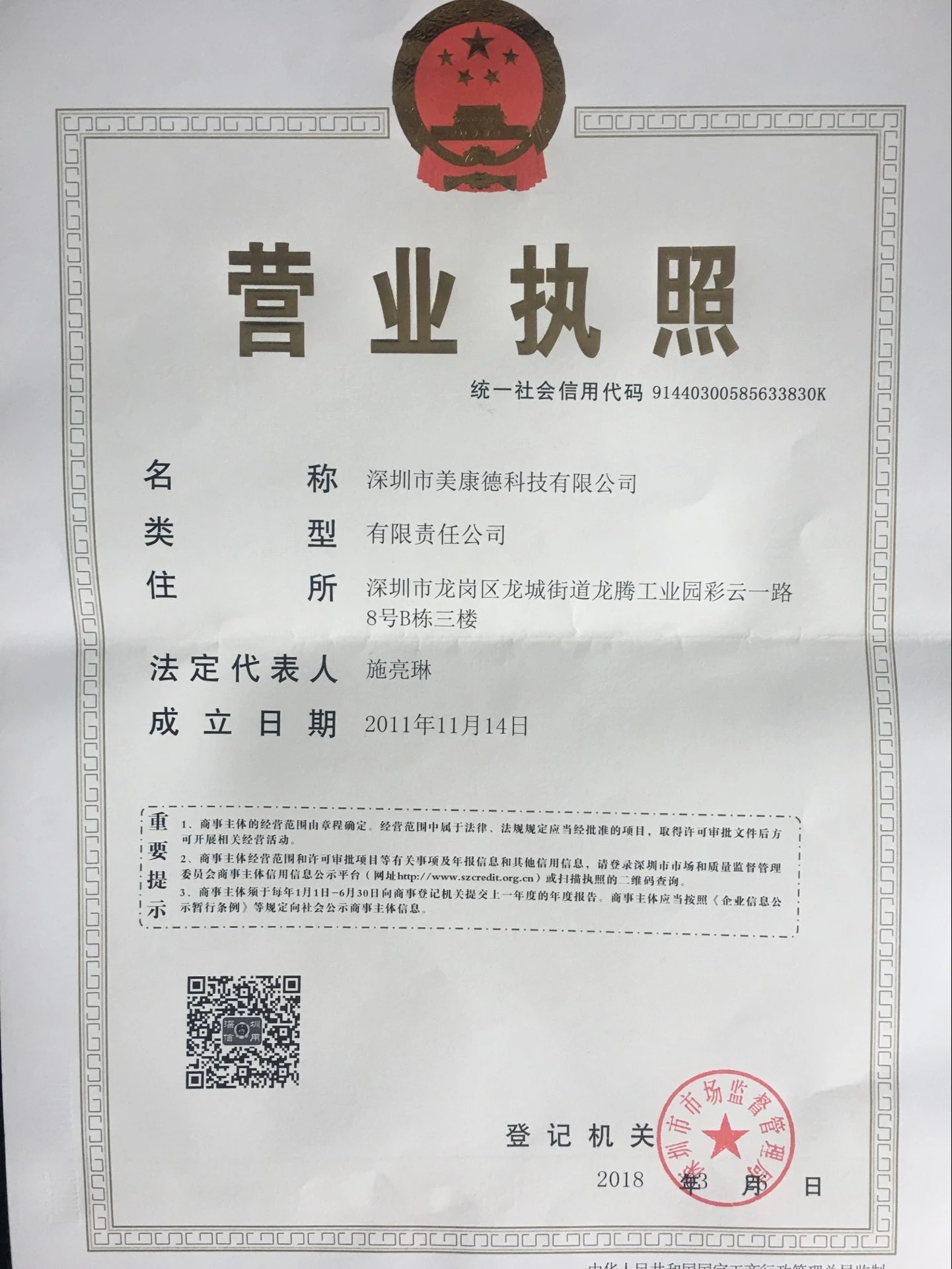 Registered address : Floor 3, Building B, No. 8, Caiyun 1st Road, Longteng Industry Zone, Longcheng Street Shenzhen Guangdong China